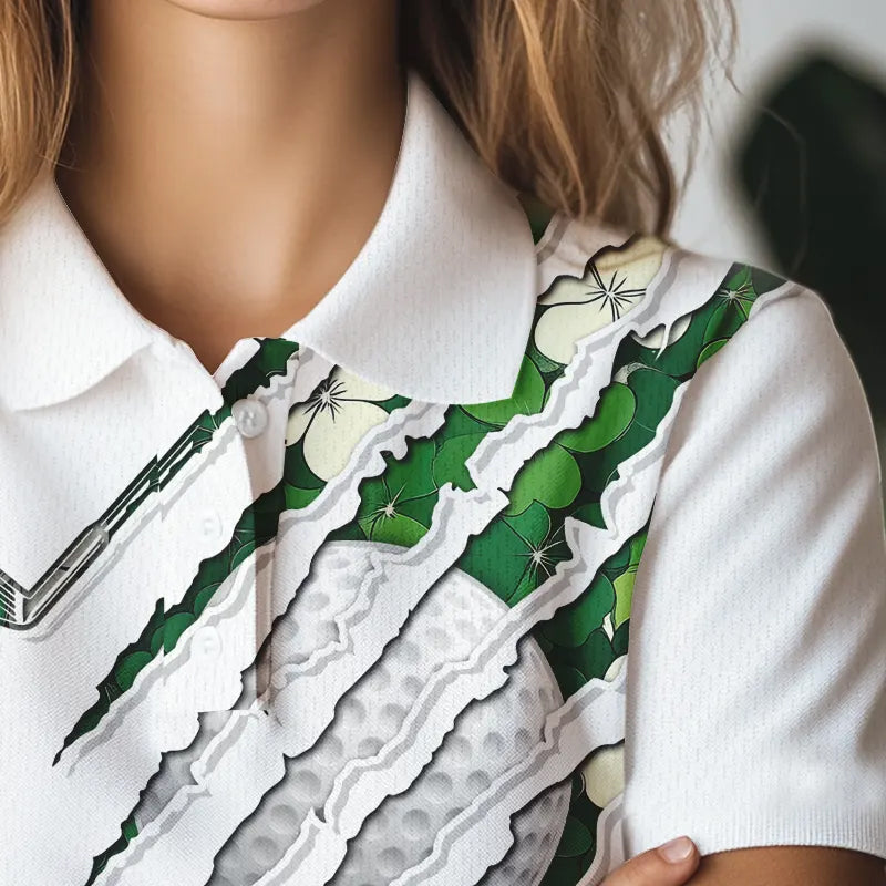 Green shamrock pattern White Women Golf Polo Shirt Custom golf clubs St Patrick day ladies golf attire NQS9476