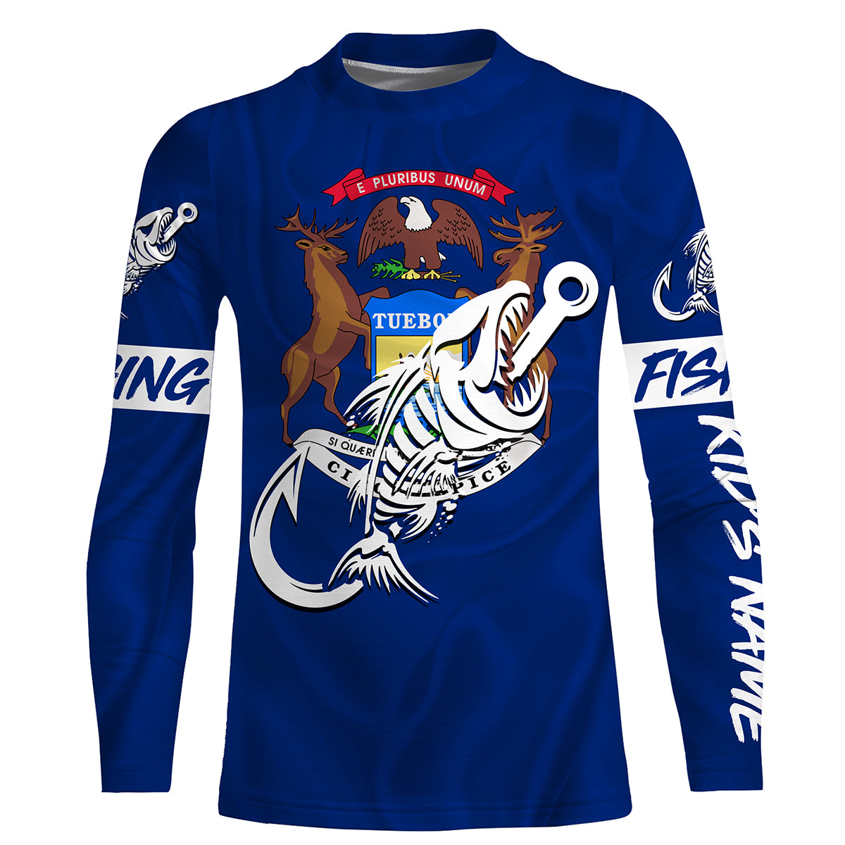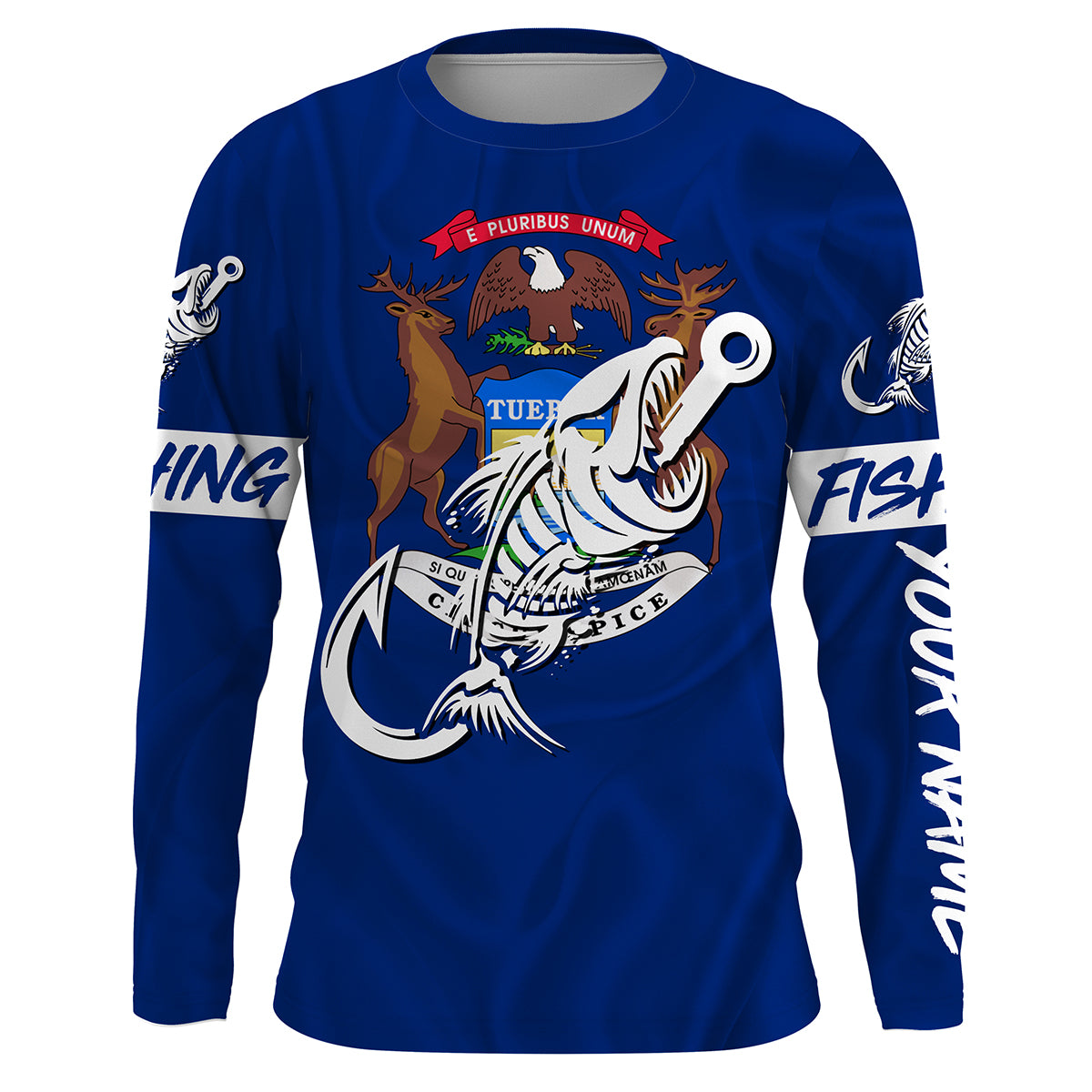 MI Fishing Custom Michigan Flag Fish hook skull Custom sun protection fishing shirts for men, women NQS3321