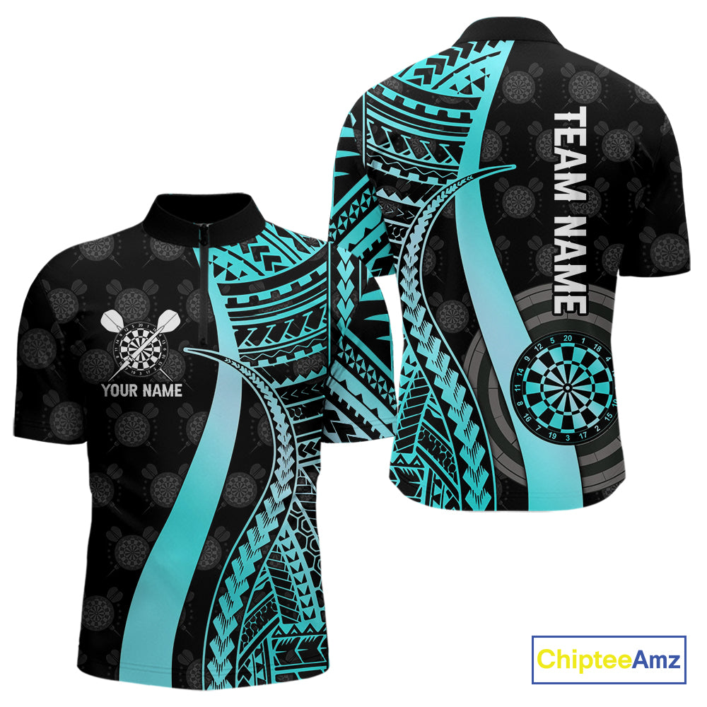 Personalized Black And Turquoise Tribal Dart Shirts For Men Custom Dart Jersey Team Polo & 1/4 Zip TDM4106