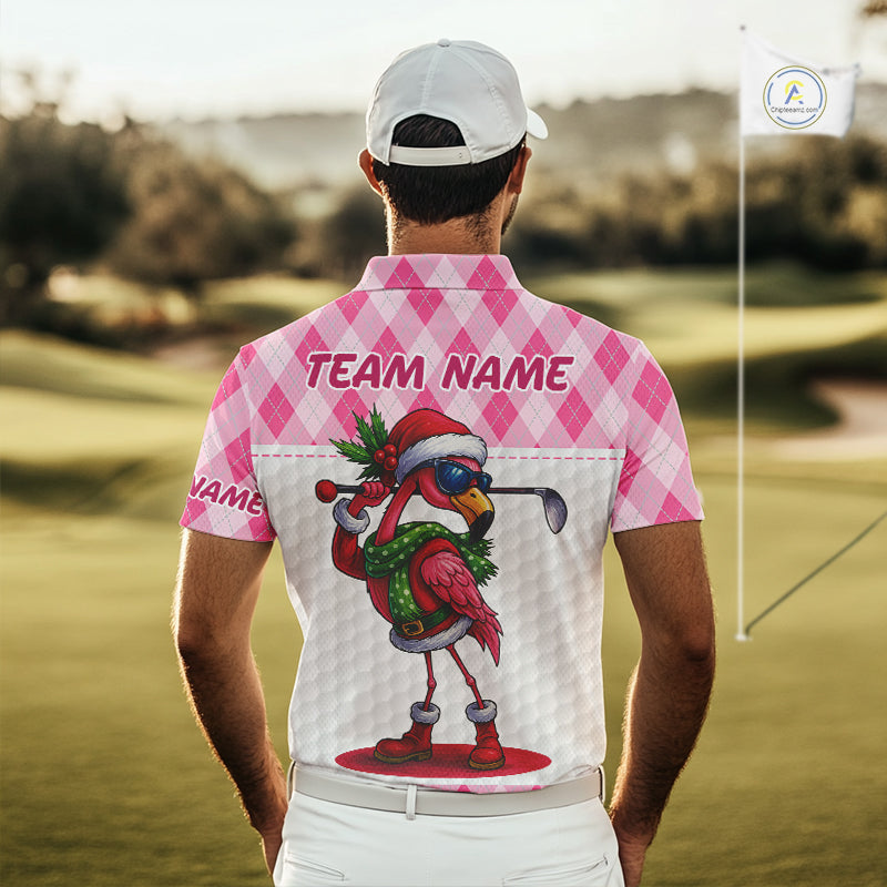 Funny Christmas Flamingo Mens golf polo shirt custom pink argyle pattern white golf apparel NQS11087