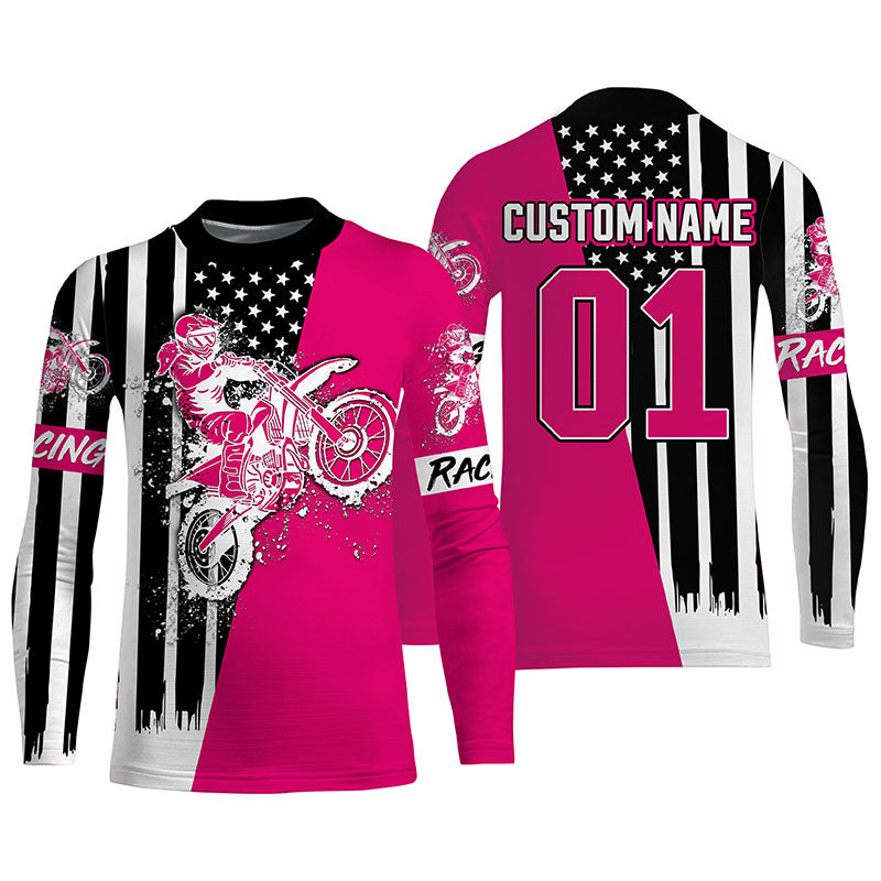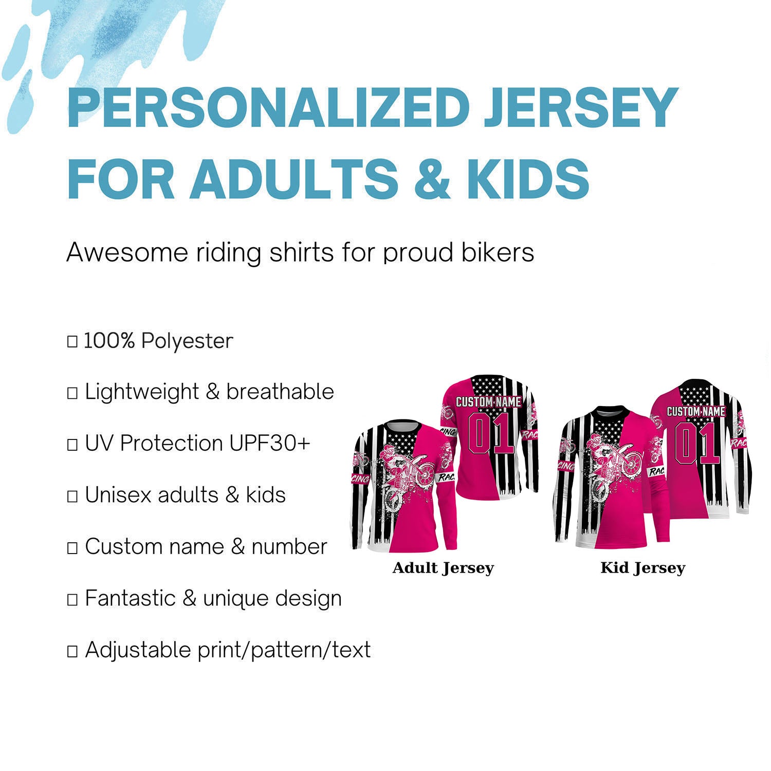Girls Women Pink Dirt Bike Racing Jersey UPF30+ Personalized Patriotic Motocross American Riding NMS1177