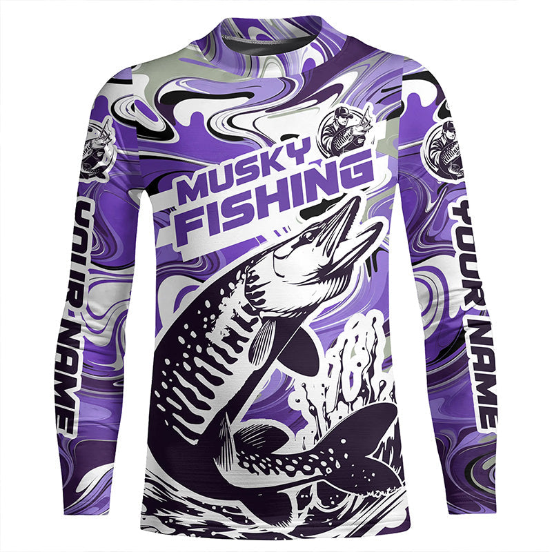 Custom Musky Long Sleeve Tournament Fishing Shirts, Water Camo Muskie Fishing Jerseys | Purple IPHW6164