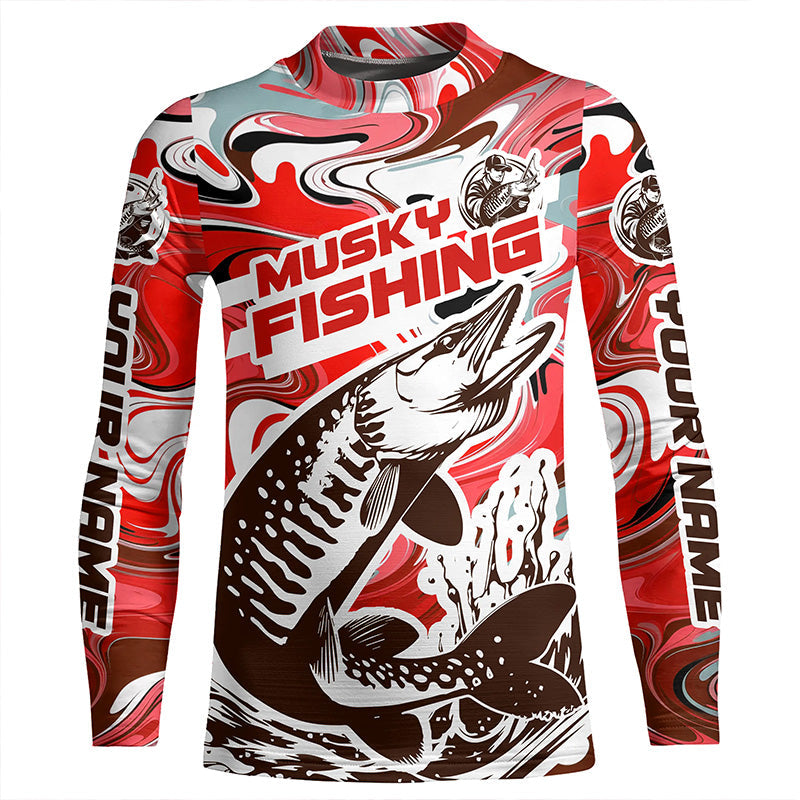 Custom Musky Long Sleeve Tournament Fishing Shirts, Water Camo Muskie Fishing Jerseys | Red IPHW6165