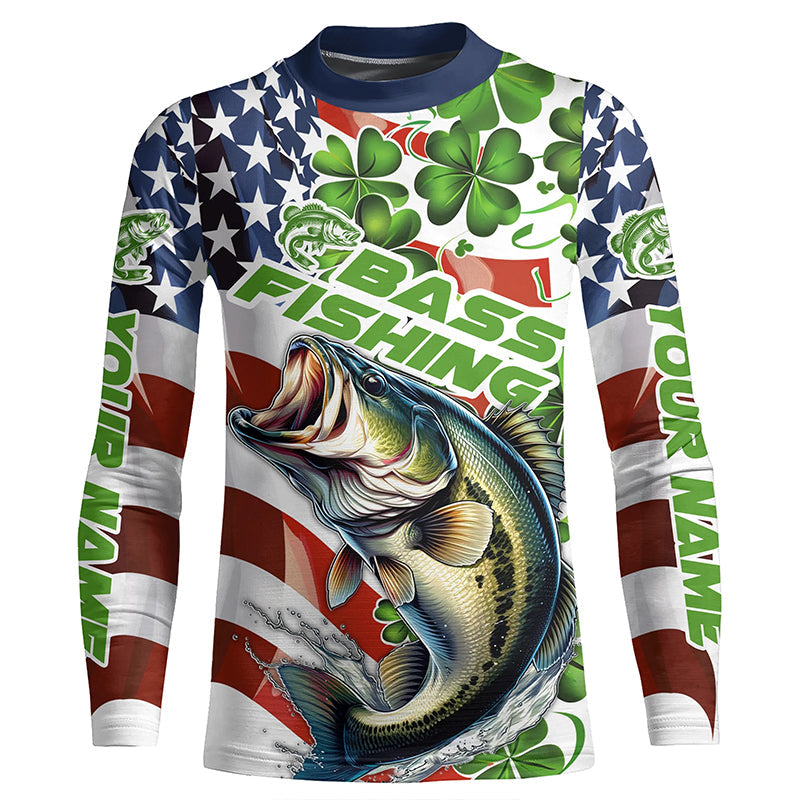 Personalized St Patrick'S Day Bass Long Sleeve Fishing Shirts, Patriotic Bass Fishing Jerseys IPHW5899