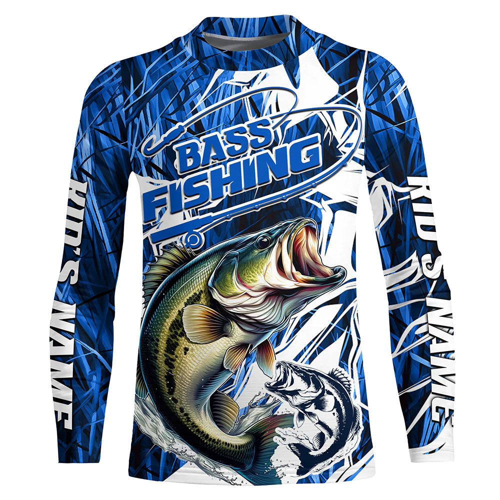 Personalized Largemouth Bass Long Sleeve Performance Fishing Shirts, Bass Fishing Jersey | Blue Camo IPHW6364