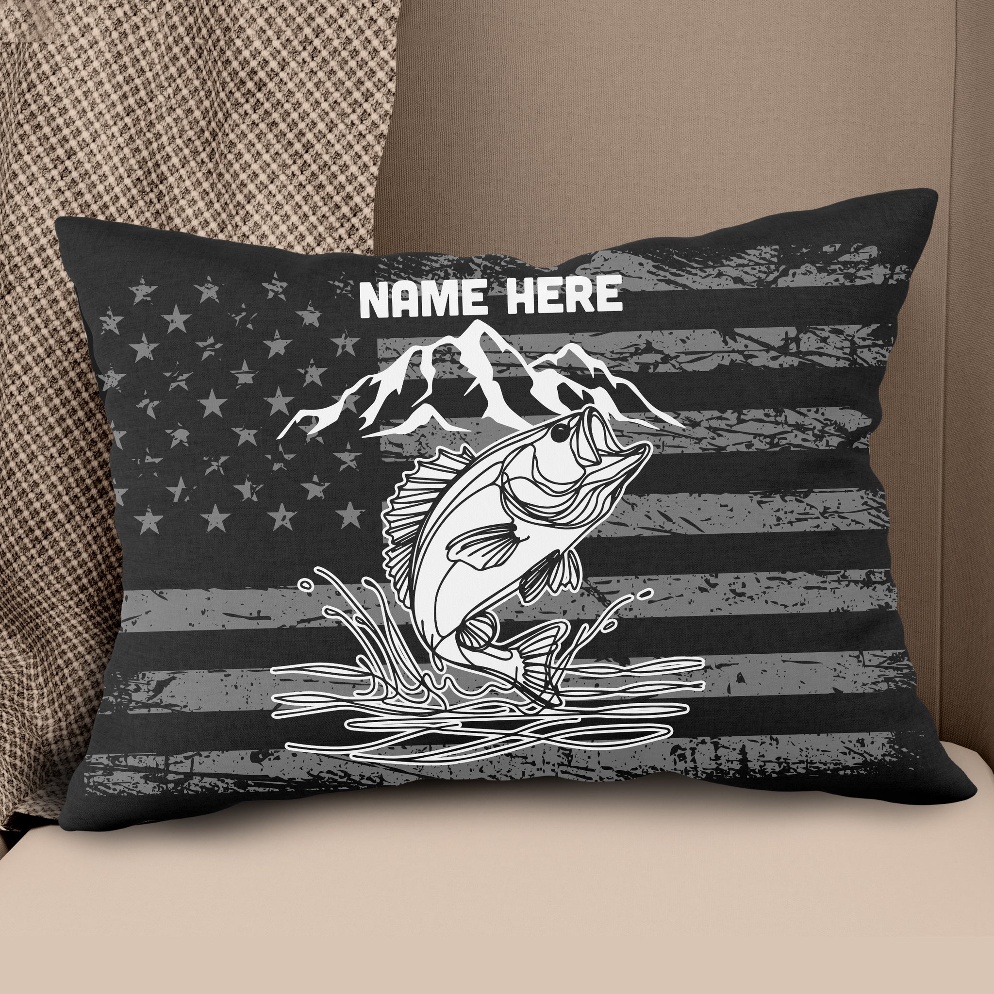 Personalized black American flag bass fishing custom name Canvas, Linen Throw Pillow NQS7027