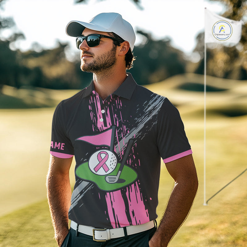 Black and pink ribbon Breast Cancer Awareness golf shirts custom Men golf polo shirts, best golf gift NQS10196