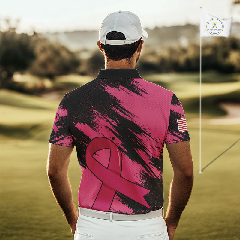 Black and Pink ribbon Men golf polo shirts Custom breast cancer American flag golf top for men NQS10140