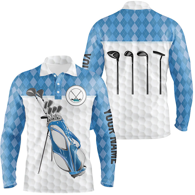 Golf bag clubs custom polo golf shirt for men, blue argyle pattern mens golf tops NQS4652
