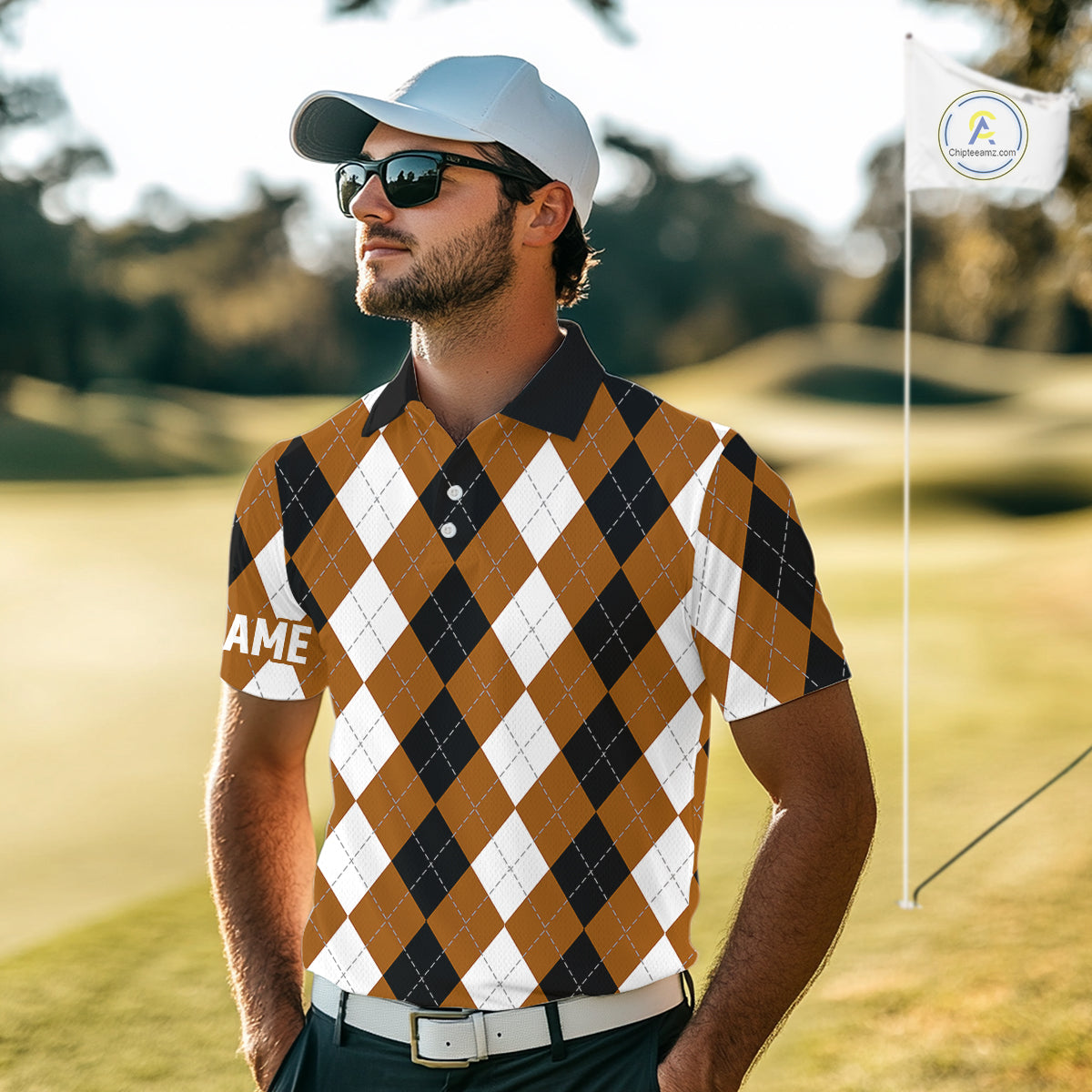 Mens golf polo shirt custom brown argyle plaid pattern golf attire for men NQS9848