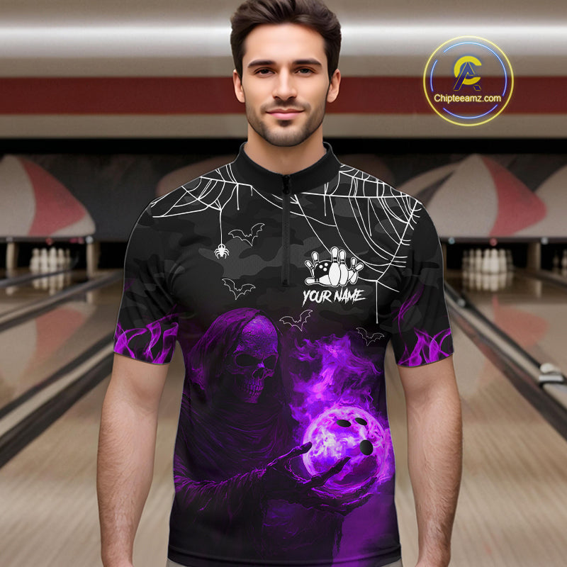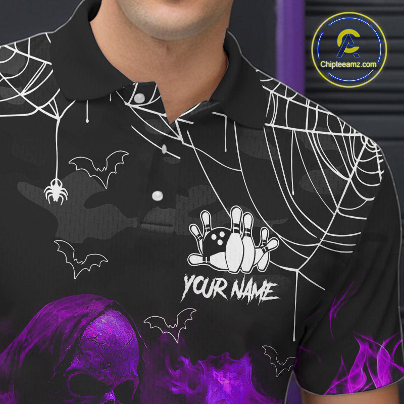 Black Bowling Camo Purple flame Skull Custom Halloween Bowling Shirts For Men, Bowling Team Jerseys NQS10706