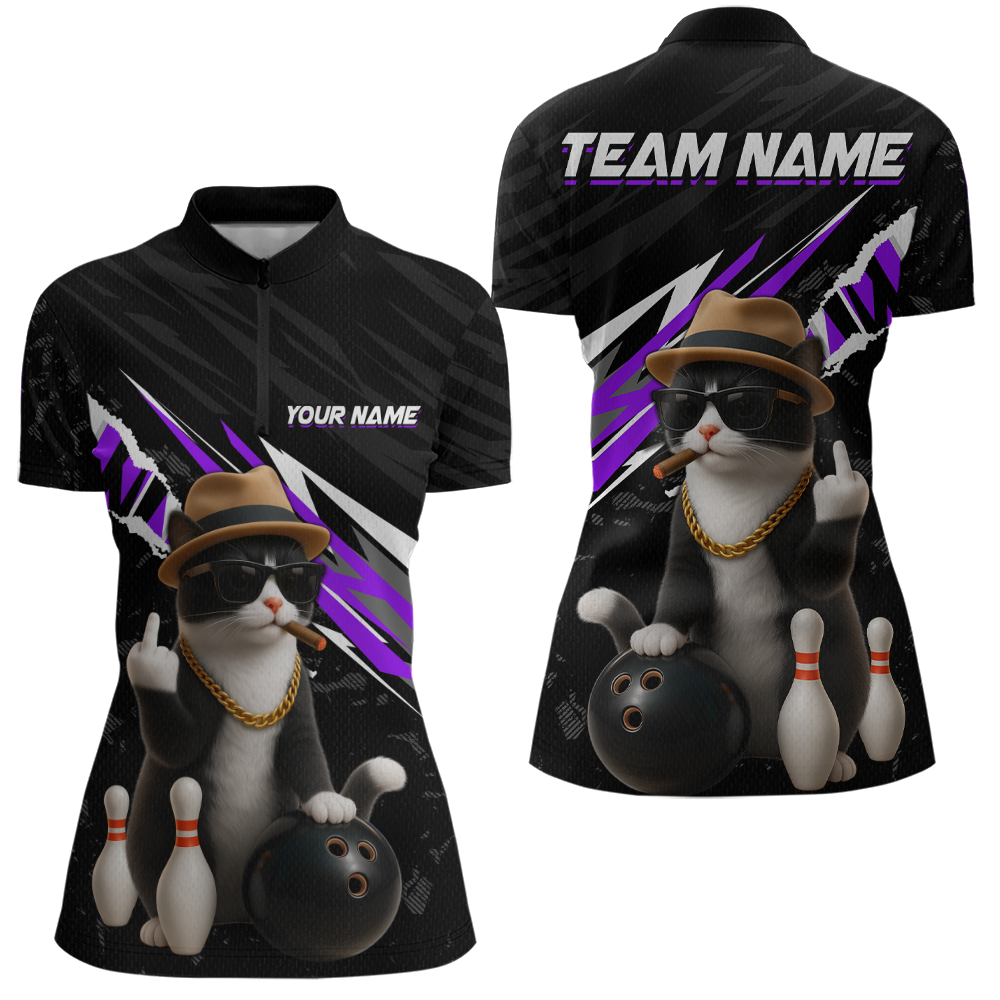Custom Purple Funny Cat Bowling Jersey for Women Bowling Shirt Polo & 1/4 Zip Bowling Team Shirts HNT136
