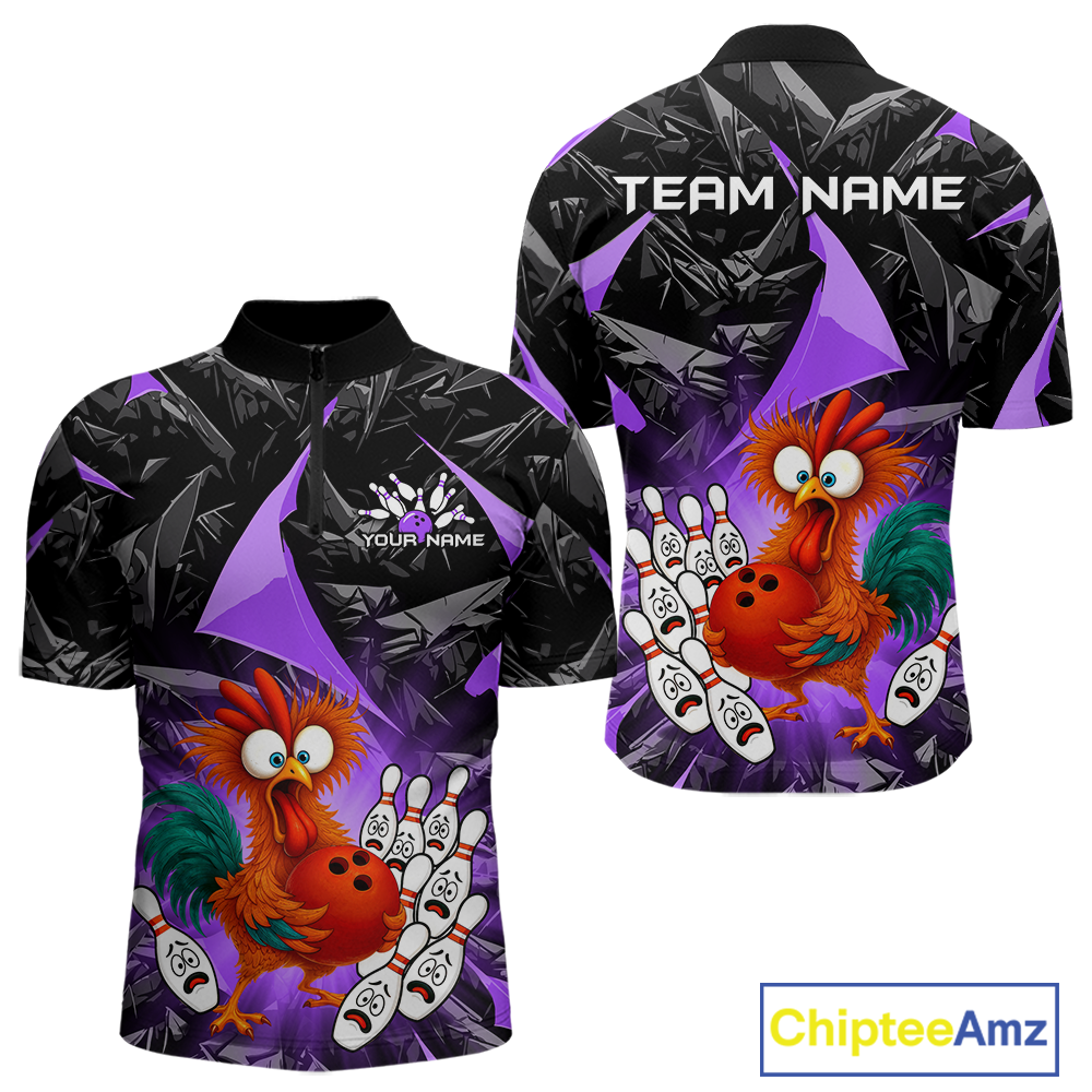 Custom Purple Funny Chicken Bowling Jersey for Men Bowling Team Shirts  Polo & 1/4 Zip HNT138
