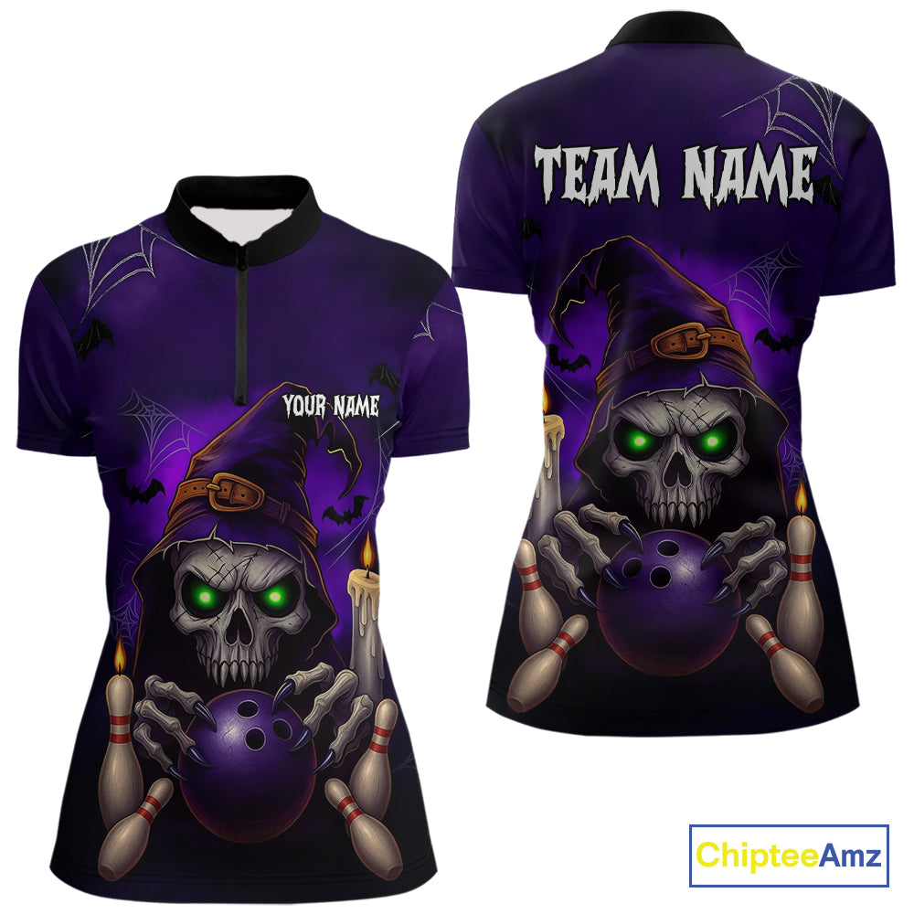 Custom Purple Skull Halloween Bowling Polo, Quarter Zip Shirts For Women, Skull Team Bowling Jersey NQS10803