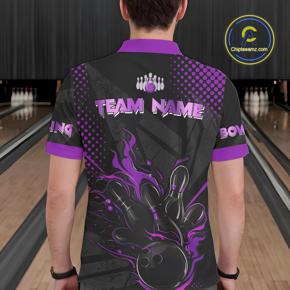 Personalized Black and Purple Flame Bowling Polo, 1/4 Zip Shirts For Men, Custom bowling Team Jerseys NQS10773