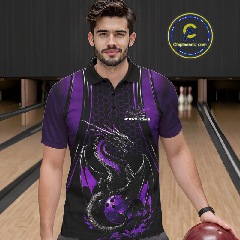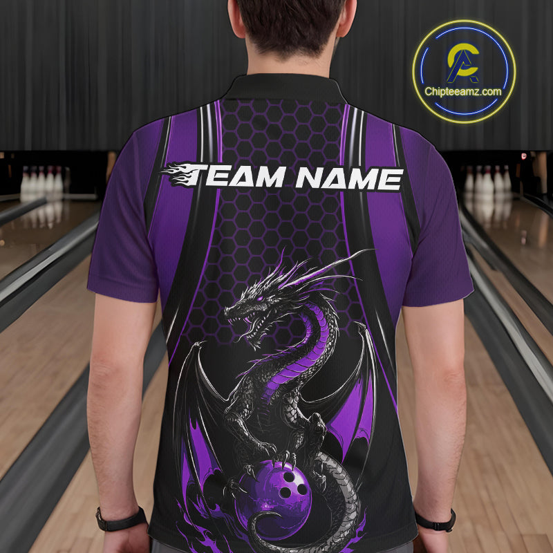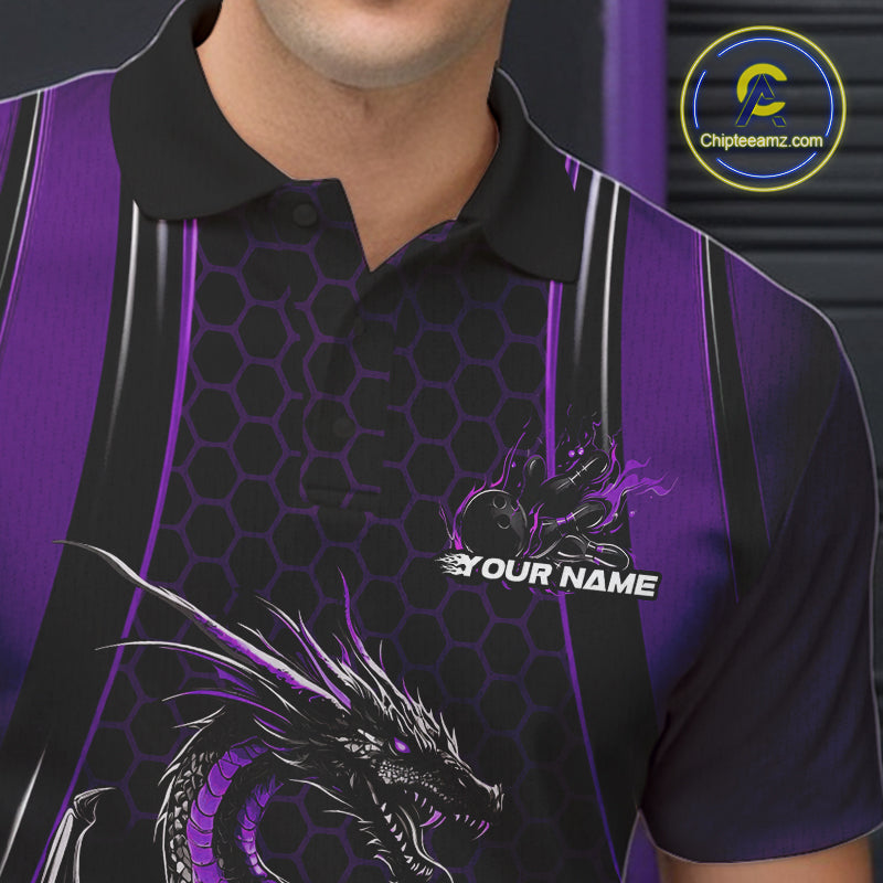 Custom Black And Purple Flame Dragon Bowling Jerseys, Dragon Bowling Team Men Polo Shirt IPHW9907