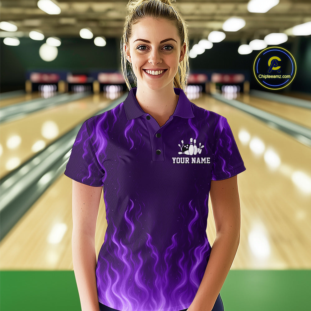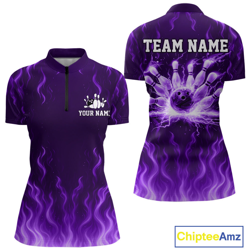 Purple flame lightning thunder Bowling polo, quarter zip shirts for Women custom Bowling team jerseys NQS10980