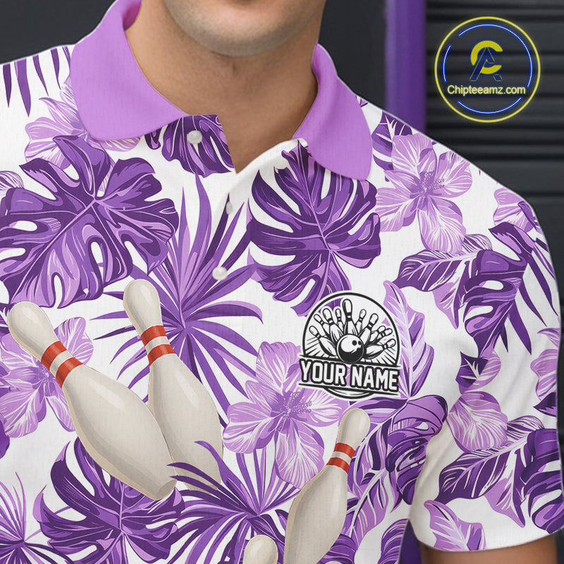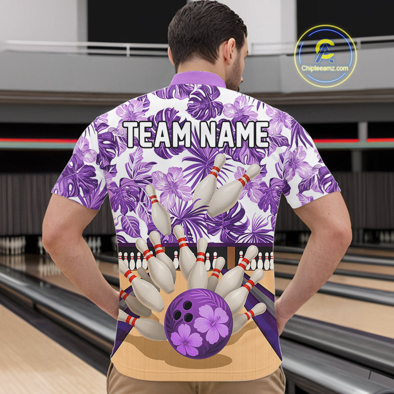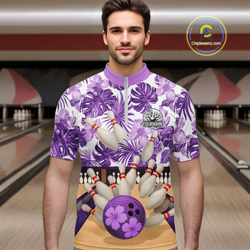 Purple tropical flower Bowling Polo, Quarter Zip Shirts For Men Custom bowling team jersey NQS10989