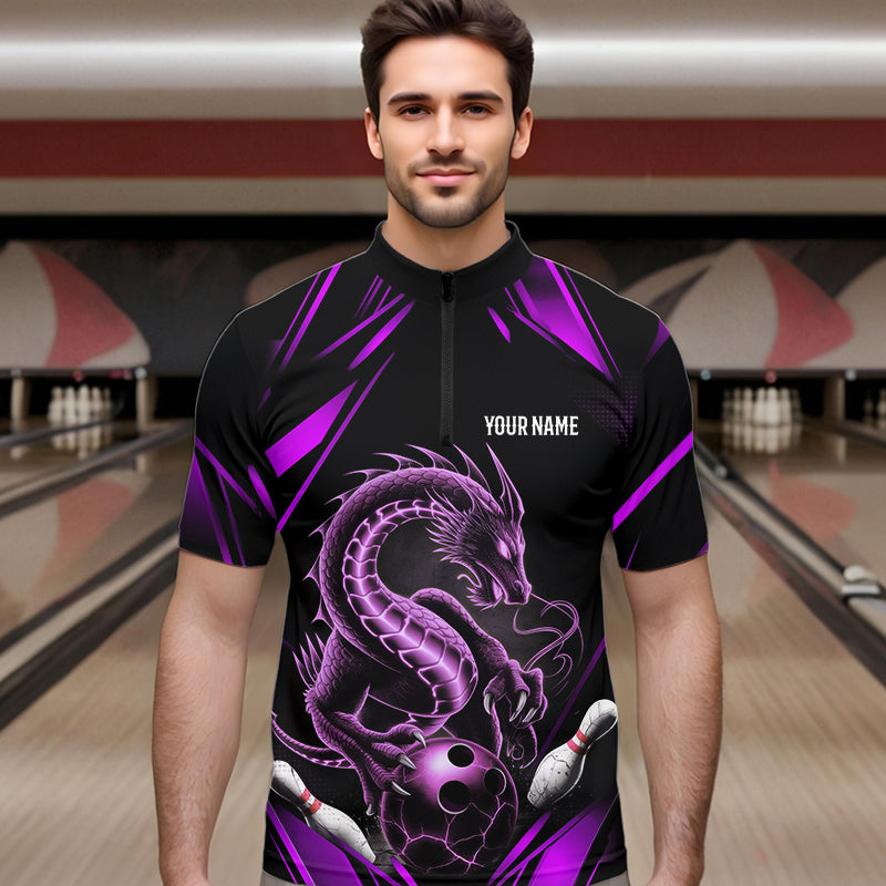 Custom Black And Purple Dragon Bowling Quarter-Zip Shirts For Men, Dragon Bowling League Shirt IPHW8673