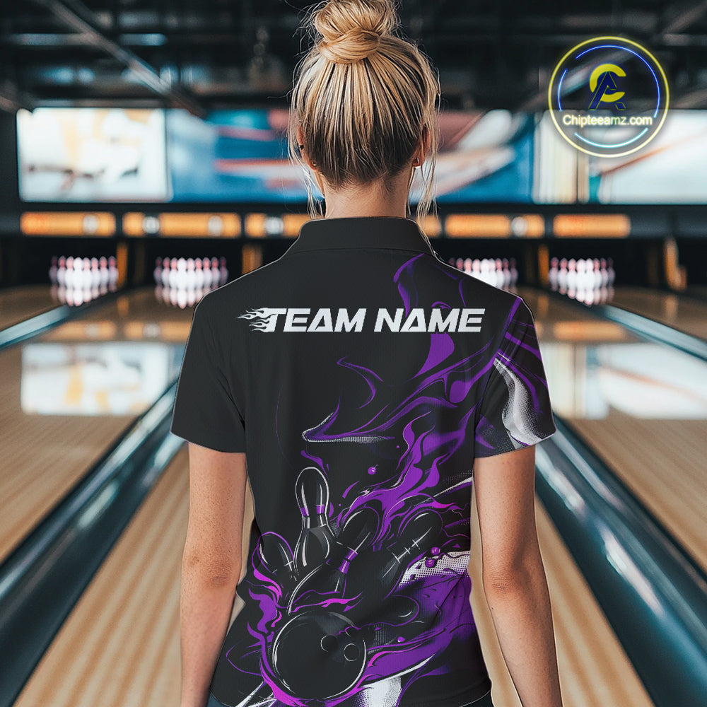 Custom Black And Purple Camo Flame Bowling Team Women Quarter-Zip Shirts, Bowling Jerseys IPHW9879