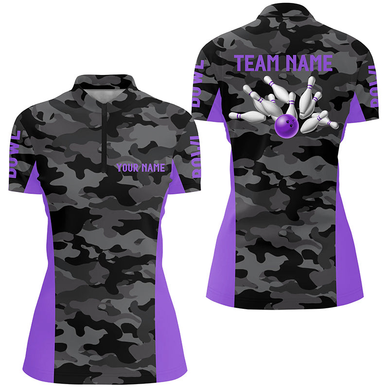 Women bowling Polo, Quarter Zip shirts Custom gray camo Bowling Team League Jerseys | Purple NQS7606