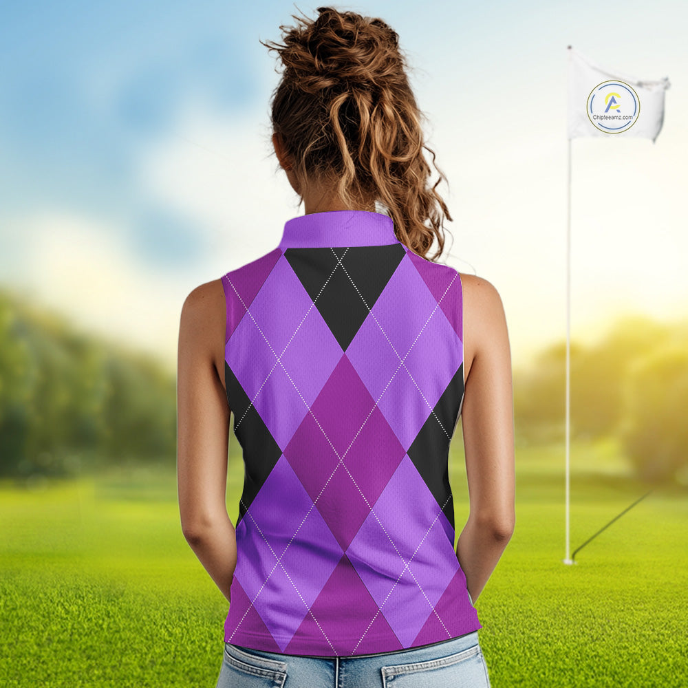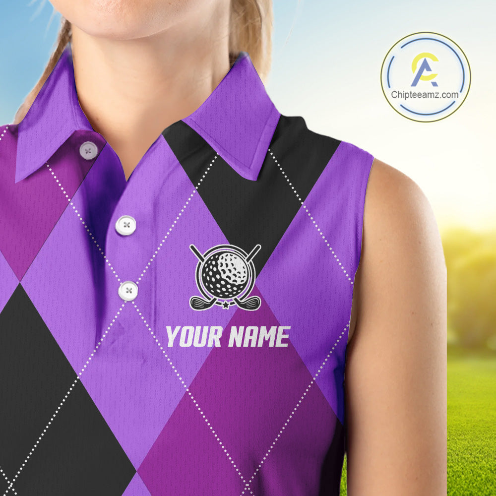 Women Sleeveless Polo Shirt custom purple and black golf argyle plaid pattern, personalized golf gift NQS10653