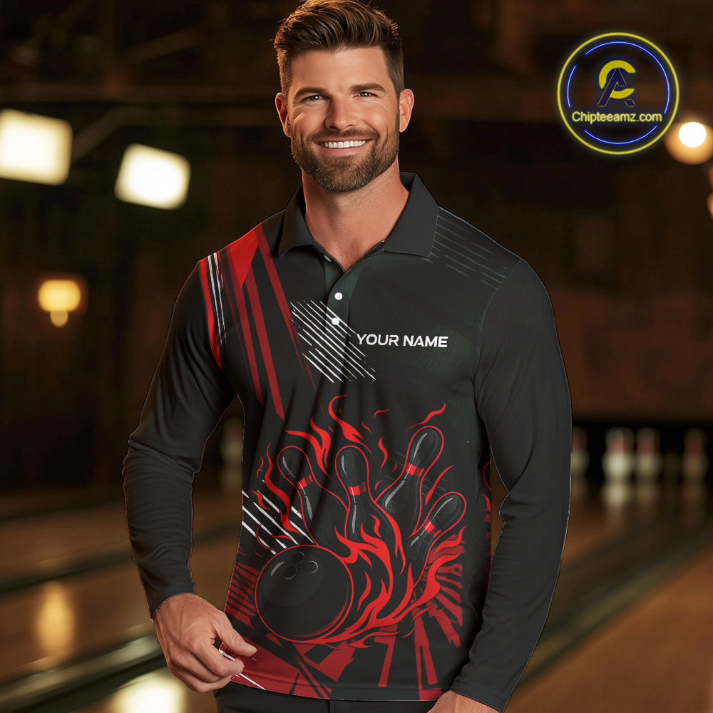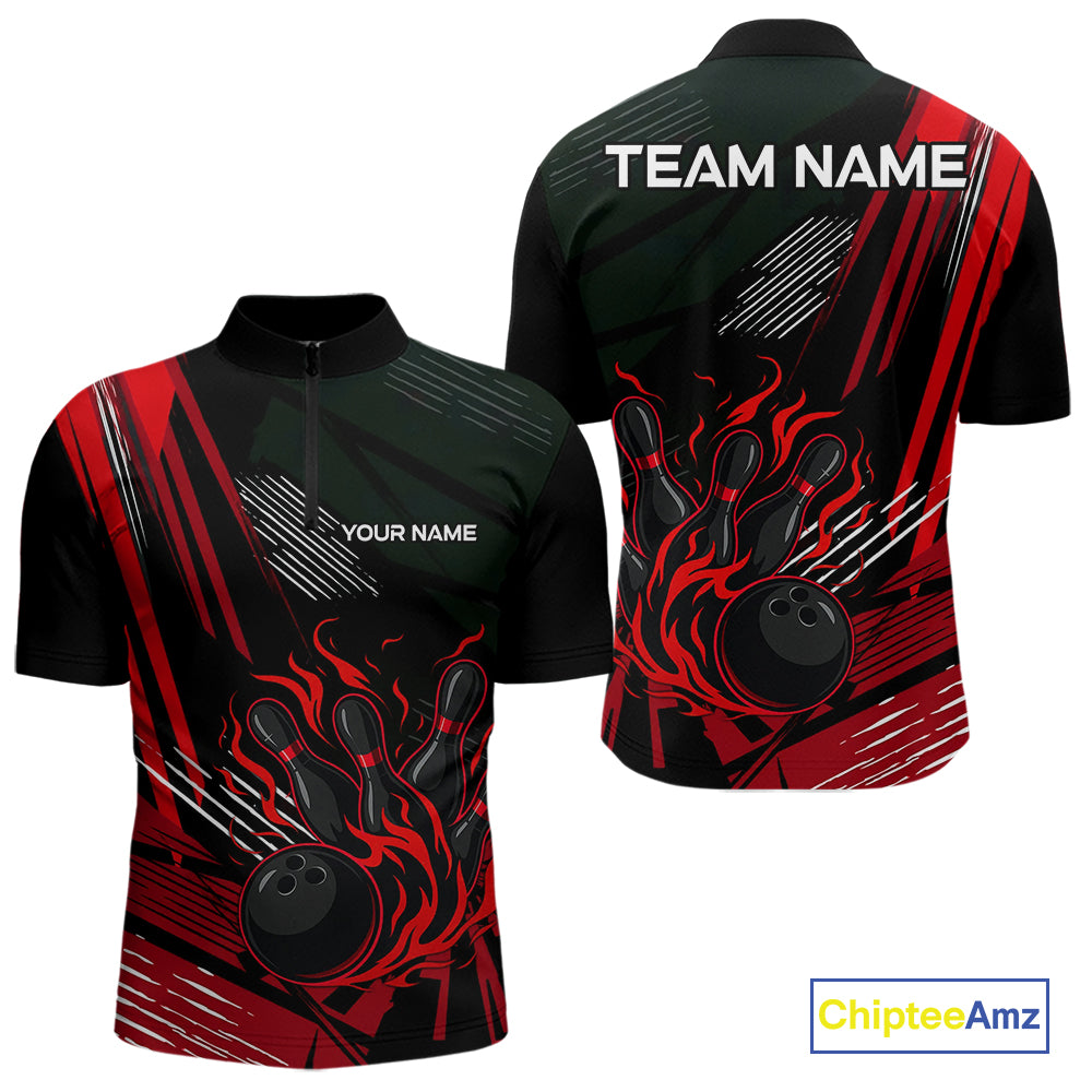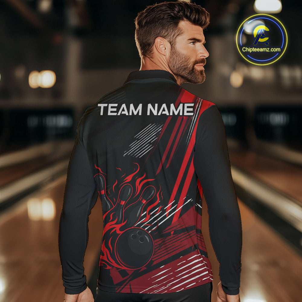 Black and Red Flame Bowling Polo, Quarter Zip Shirts For Men Custom Bowling Outfit Team Jerseys NQS10192