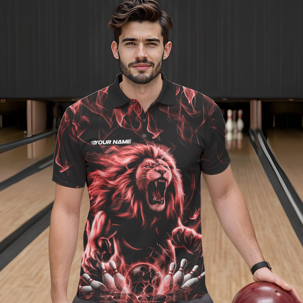 Custom Black And Red Flame Lion Bowling Men Polo Shirts, Lion Bowling Team Uniform IPHW8983