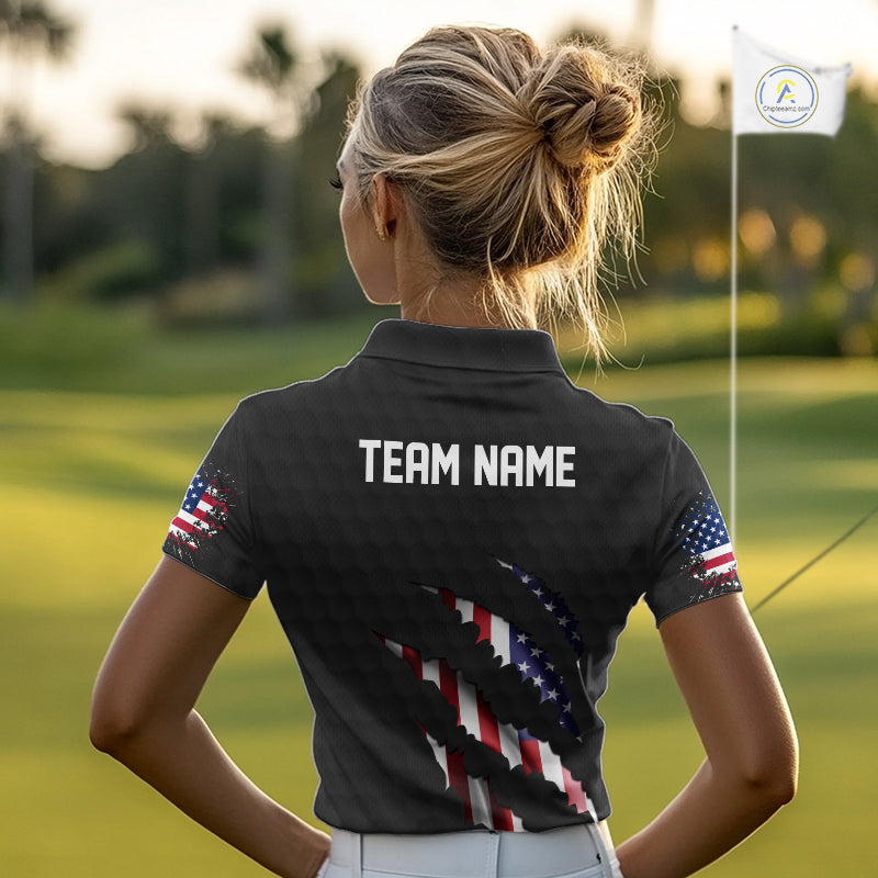 Personalized American Flag Women golf polo shirt, Custom Patriotic Golf Team Shirts For ladies| Black NQS10178