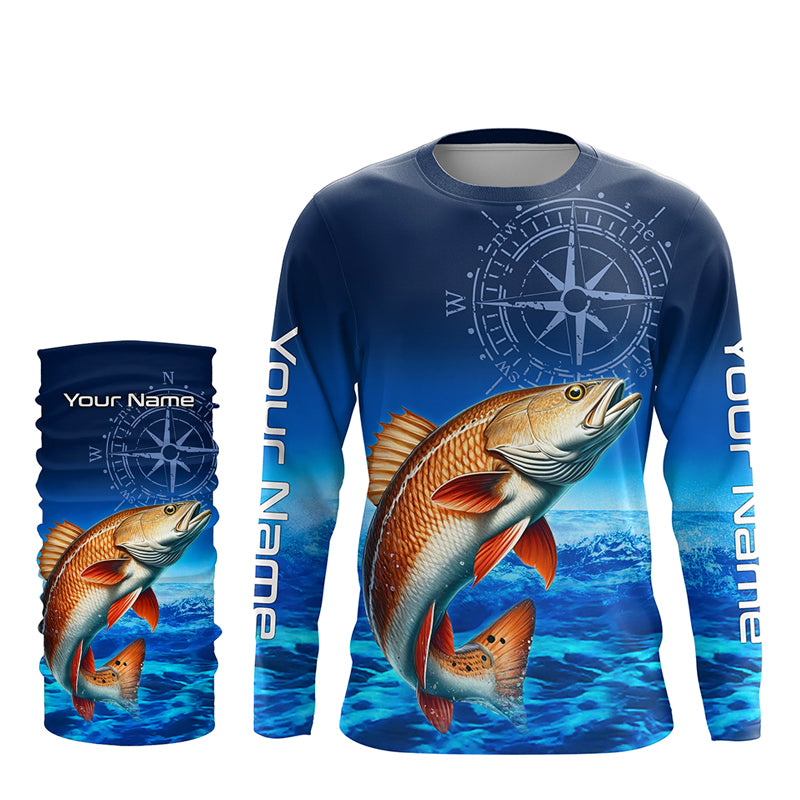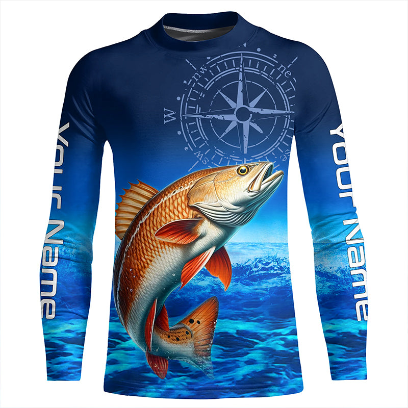 Personalized Redfish red drum Blue Long Sleeve Performance Fishing Shirts, compass tournament Shirt NQS5851