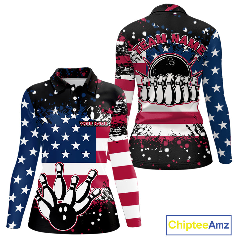 American Flag Black Bowling Polo, 1/4 Zip Shirts For Women custom patriotic retro bowling team shirts NQS10210