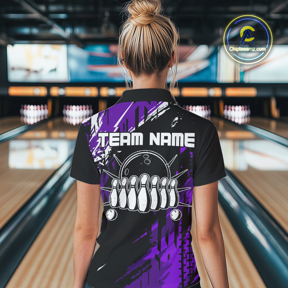 Black and Purple Women bowling shirts Custom retro bowling ball and pins bowling team league jerseys NQS10642