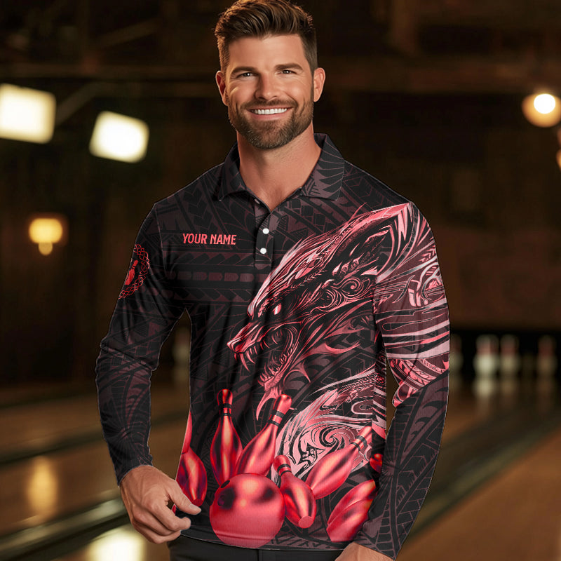 Black and Red Dragon Tribal Bowling Polo, 1/4 Zip Shirts For Men Custom Retro Bowling Team Jerseys NQS9629