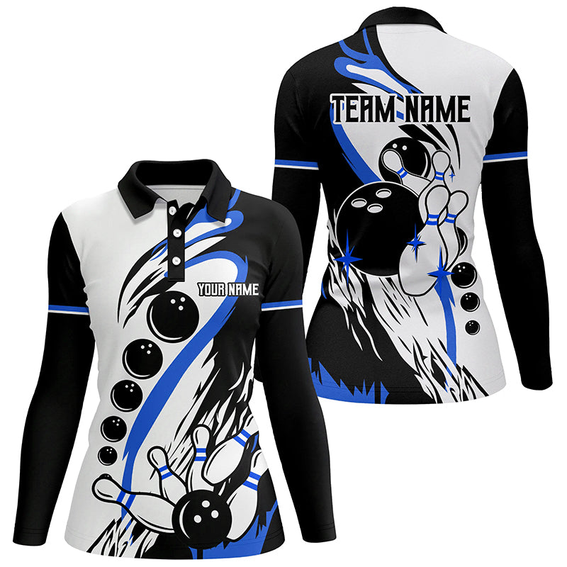 Black and white retro bowling league jerseys custom Women Bowling Polo Shirts, gifts for bowler | Blue NQS7154