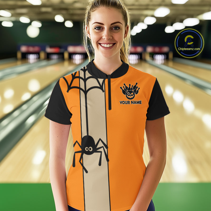 Orange and Black Halloween Retro Bowling Polo, 1/4 Zip Shirts For Women Custom Bowling Team Shirt NQS10464