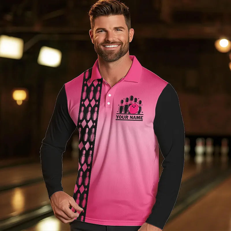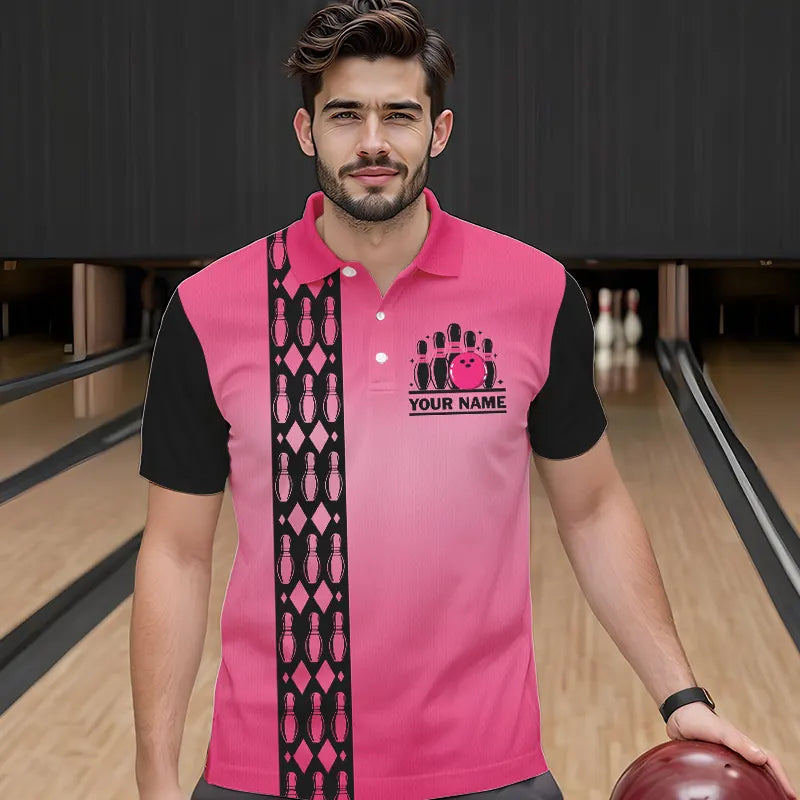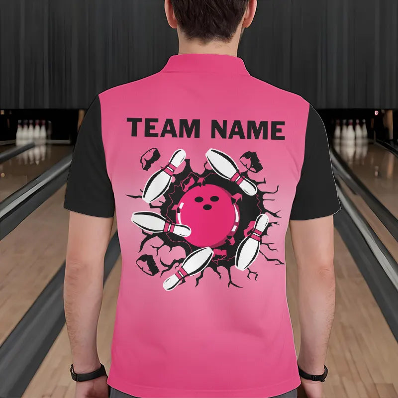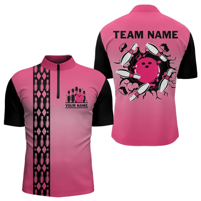 Personalized Black and Pink Retro Bowling Polo, Quarter Zip Team Shirts For Men Custom Bowling Gifts NQS9422