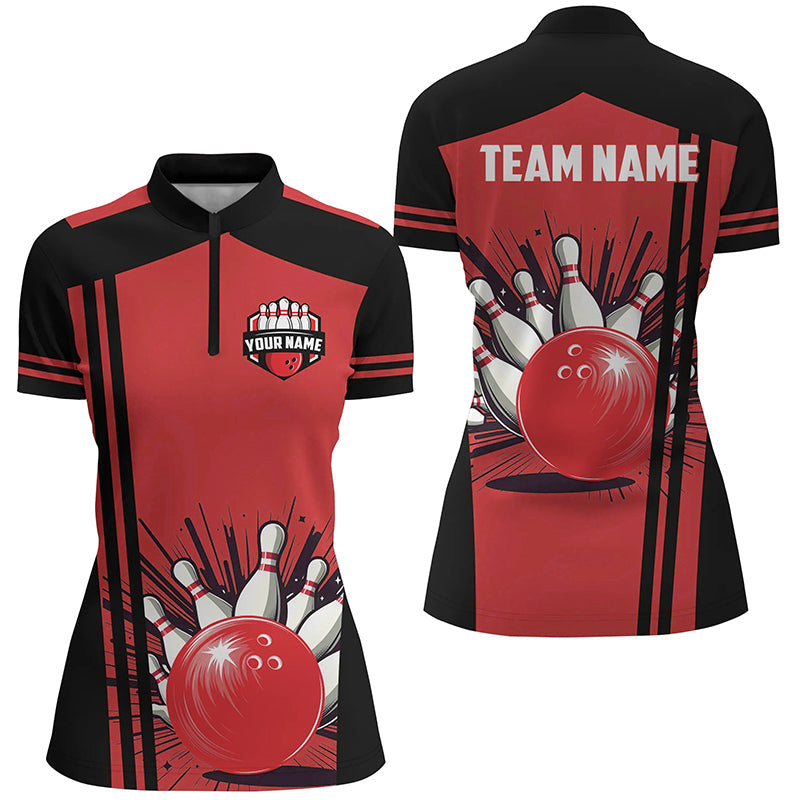 Personalized black and red retro Bowling Polo, Quarter Zip shirts For Women, Bowling Team Jerseys NQS7687