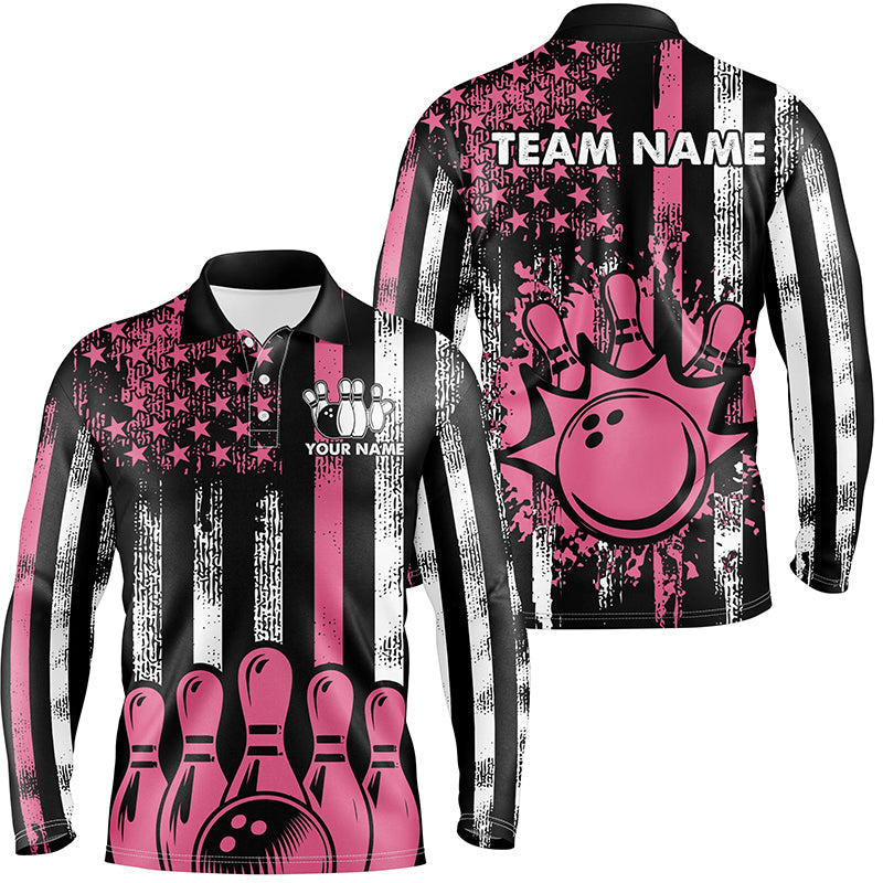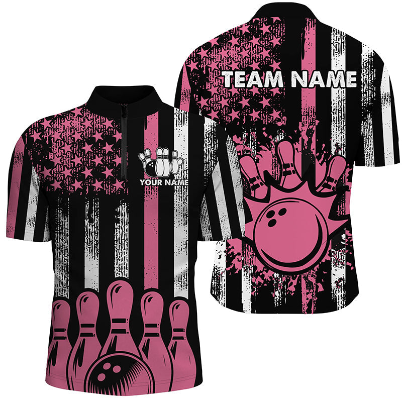 Pink American Flag Retro Bowling Polo, Quarter zip Shirt For Men custom breast cancer bowling jerseys NQS8465