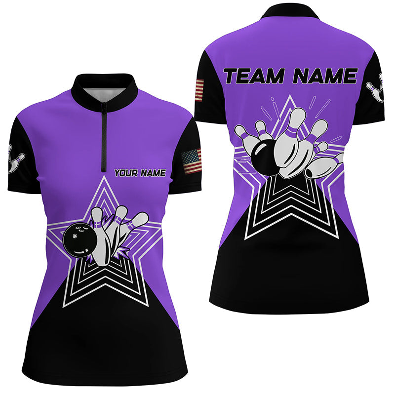 Purple & Black retro bowling ball pins star custom Women's bowling Polo, Quarter Zip shirt team jersey NQS7831