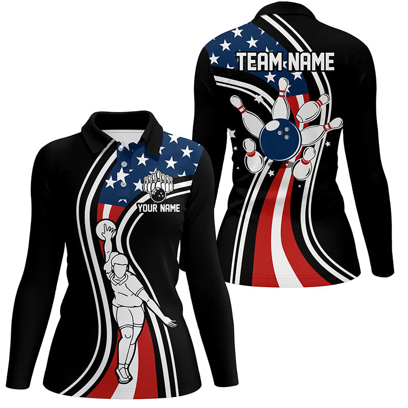 Retro bowling Polo, Quarter Zip shirts for Women Custom American flag patriotic team bowling jerseys NQS7895