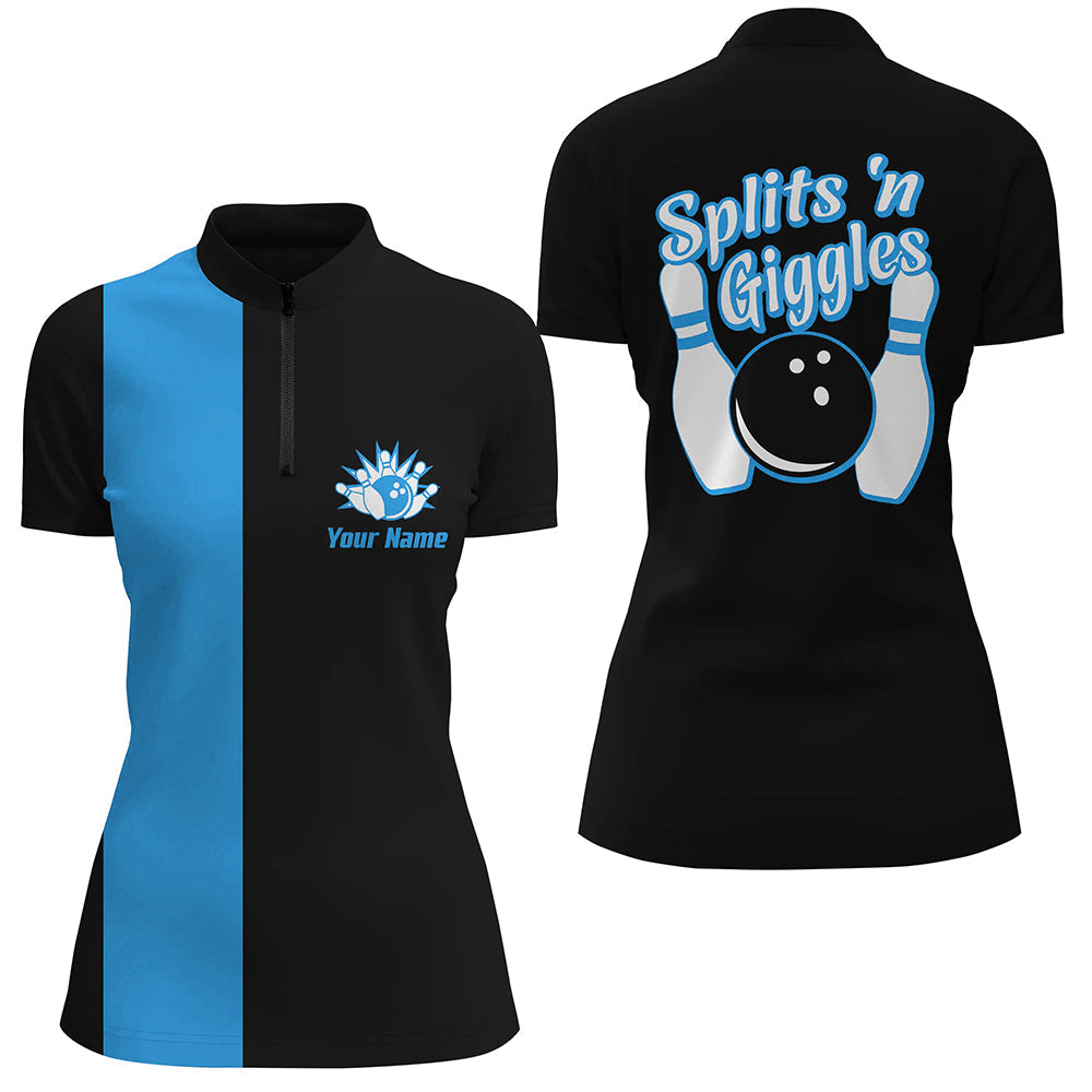 Splits'n Giggles Bowling polo, 1/4 zip Shirt For Women Personalized black blue retro bowling Jersey NQS8487
