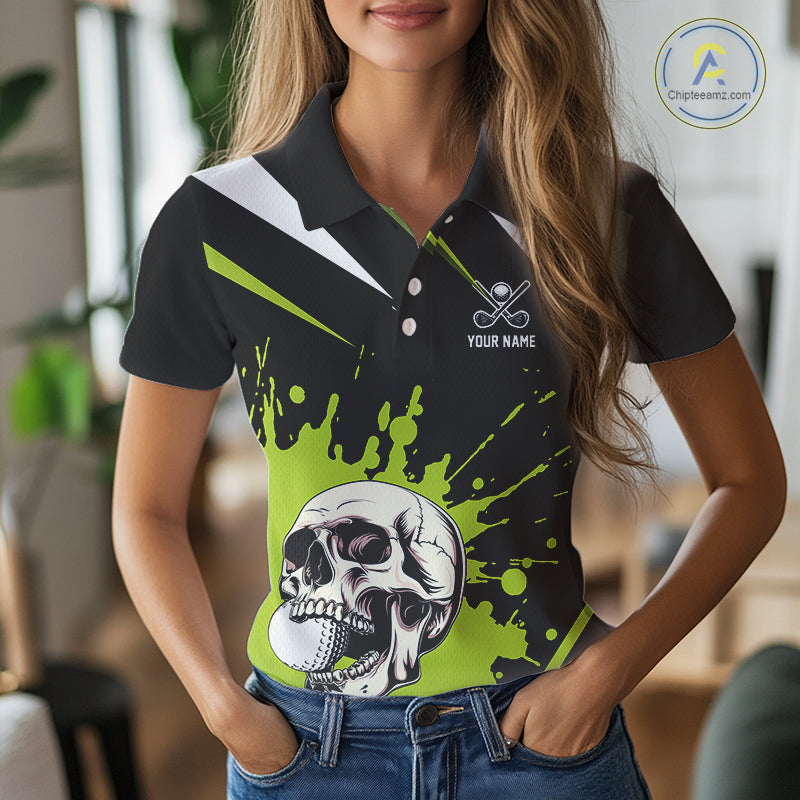 Black and Green Skull Golf polo shirts for Women Custom team golf outfits ladies, cool golf gifts NQS10025