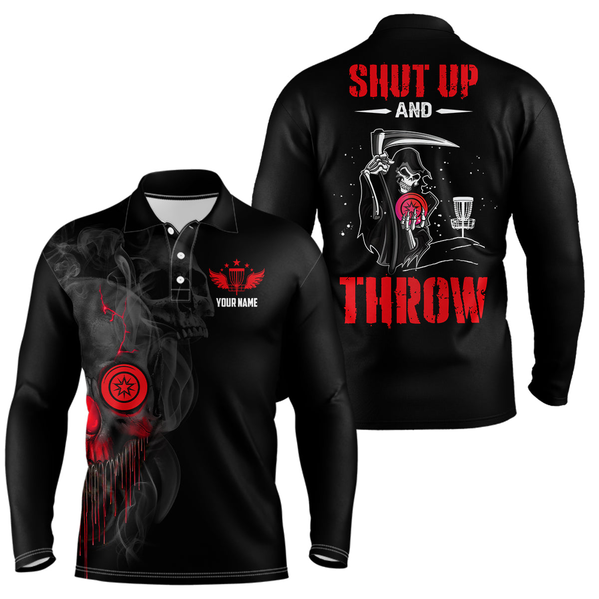 Custom Shut Up And Throw Smoky Skull Red Mens Disc Golf Polo Shirts Scary Golf Gifts For Men LDT0452