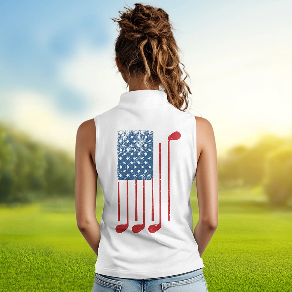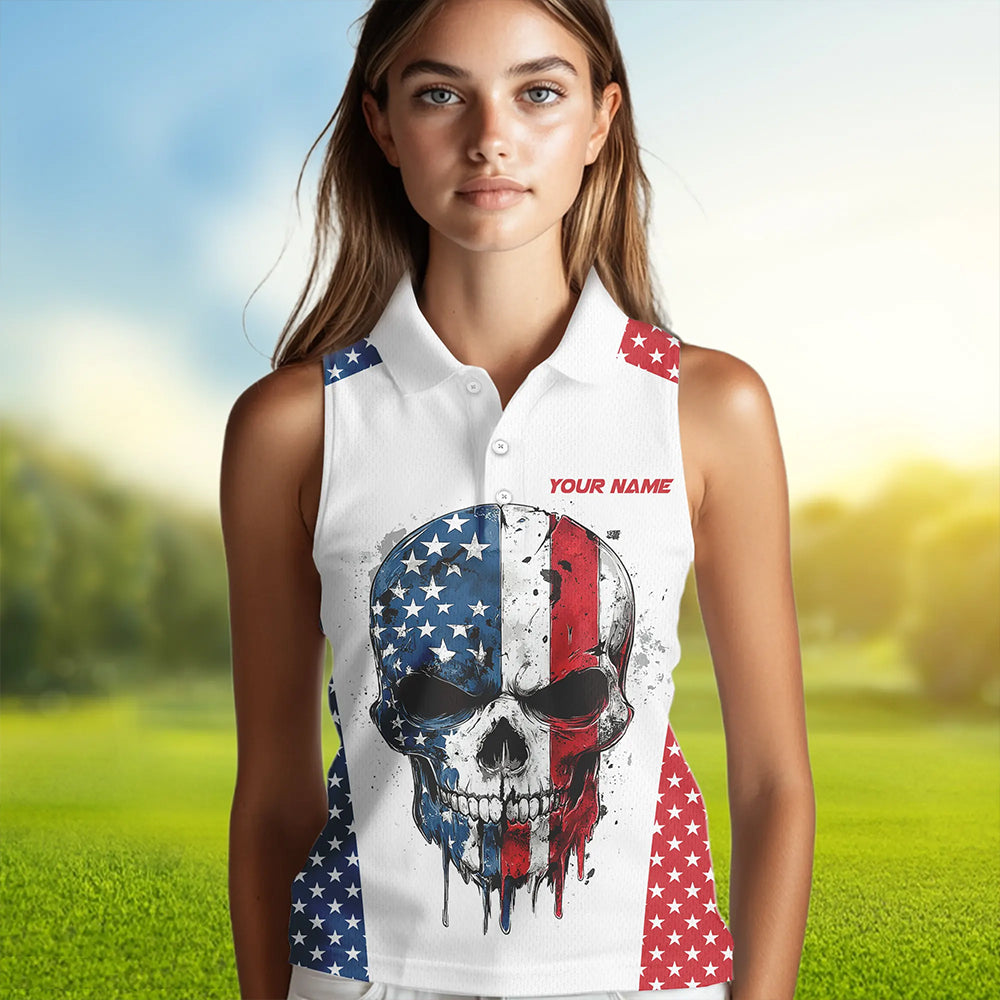 Red, white and blue American Flag Skull Women sleeveless polos custom patriotic golf attire for ladies NQS9375