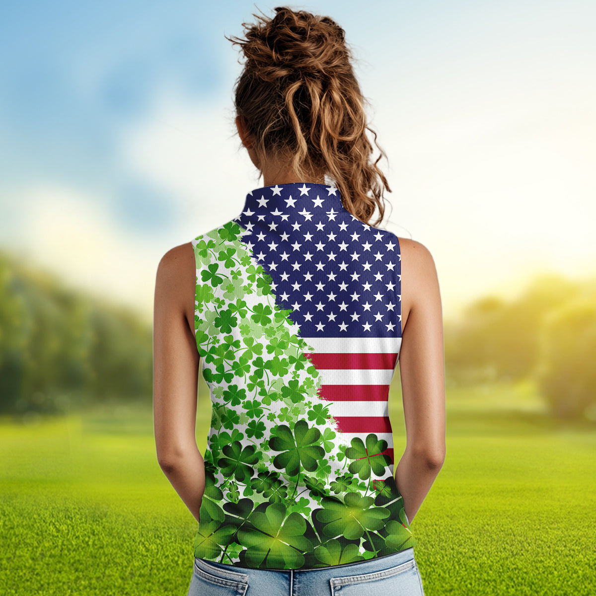 American flag St Patrick day shamrock pattern custom Women sleeveless polo shirt, golf outfits ladies NQS9580