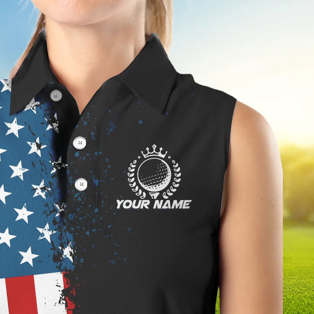 Black American Flag Women Sleeveless Polo Shirt Custom Golf attire for ladies, patriotic golf gifts NQS9696