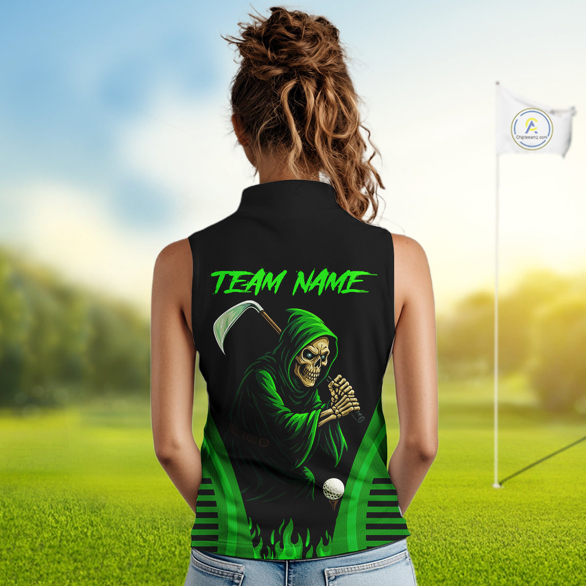 Black and Green Flame Skull Reaper Women Sleeveless Polo Shirt Custom team golf outfits for ladies NQS10713