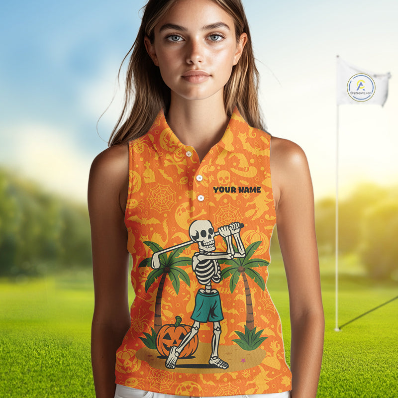 Funny orange Halloween pattern Skull Sleeveless Golf Polo Shirt Custom golf clothes for ladies NQS10769