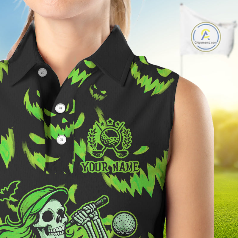 Green and Black Halloween Pattern Funny Skull Golf sleeveless polo shirt Custom Halloween golf top NQS10662