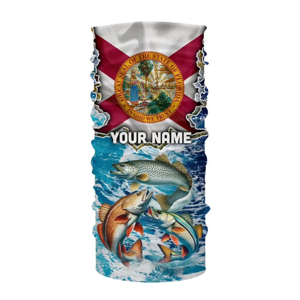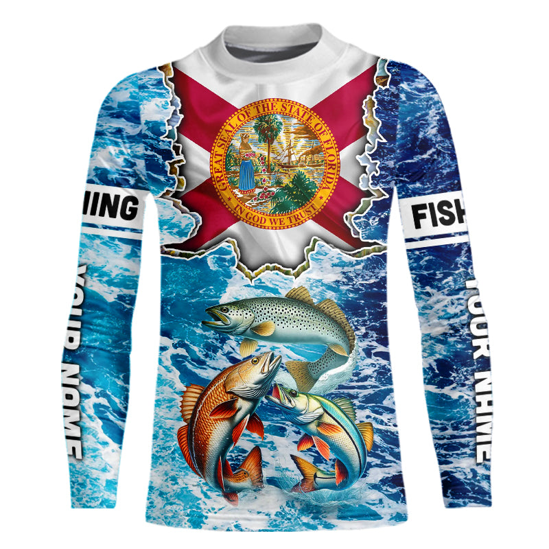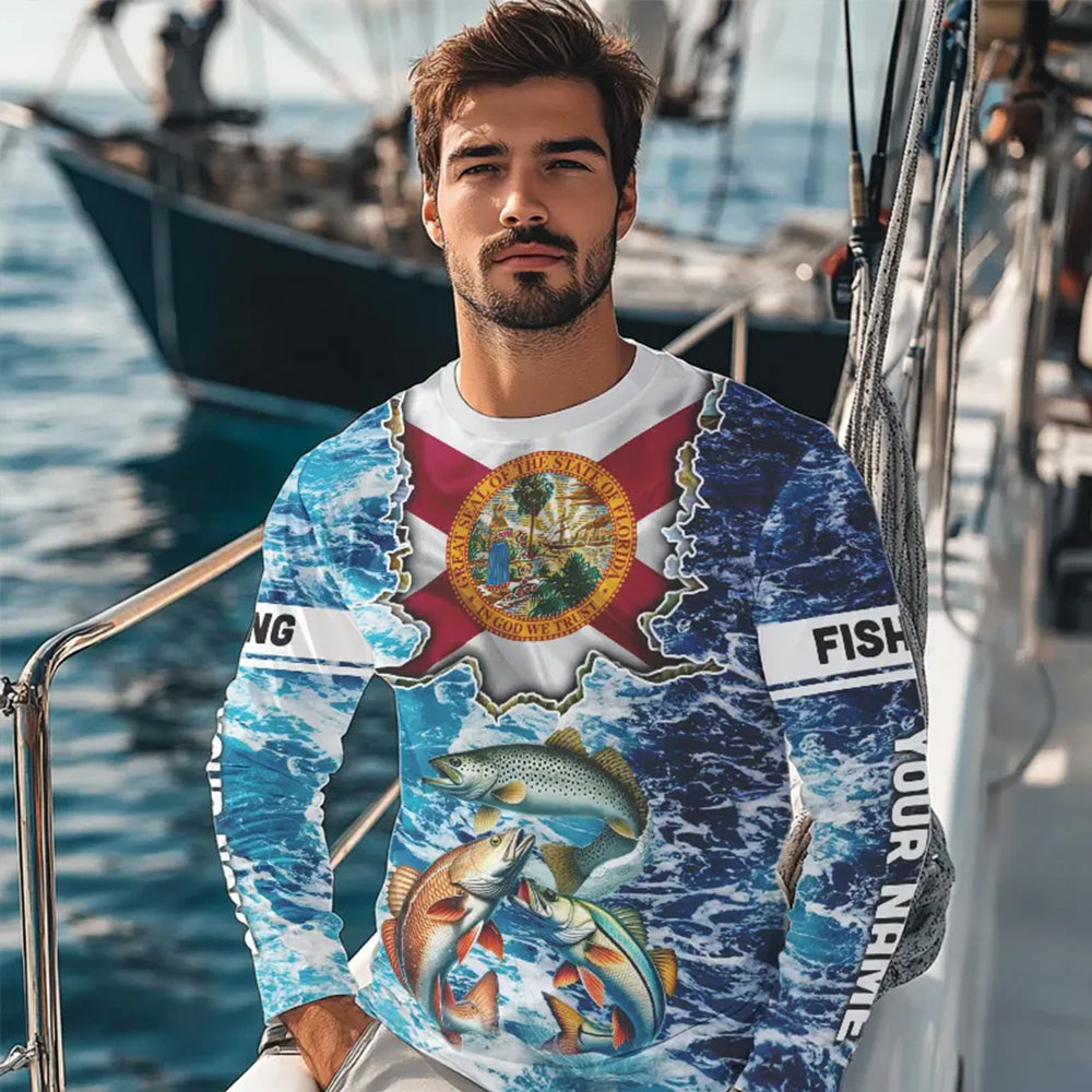 Florida Flag Redfish, trout, snook blue wave camo custom name performance long sleeve fishing shirts NQS9488